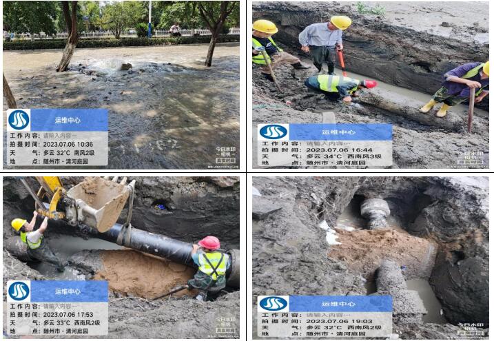 7月6日上午10點20分,客服人員接到群眾的熱線電話,告知清河路清河庭院附近路面大量跑水,運維中心搶修人員接到消息迅速前往,十五分鐘到達(dá)現(xiàn)場,通過專業(yè)技能和判斷,確定為DN400主管道爆破,測漏人員立即協(xié)助精準(zhǔn)定位漏點,盡量減少開挖面,為搶修爭取時間,該管道會直接影響周邊黃龍五隊、清河庭院、東方小區(qū)、楚苑小區(qū)、雙橋家具大市場等小區(qū)和企業(yè)大面積水小或停水??崾铍y耐,為盡快解決群眾用水問題,維修人員在35°高溫下連續(xù)奮戰(zhàn)8小時,于當(dāng)晚7點30分恢復(fù)正常供水,及時避免了周邊居民下班后正常生活用水的問題。
