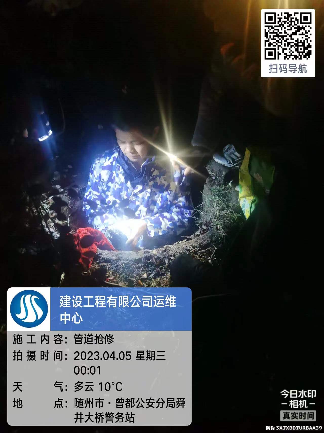 夜幕里,在探照燈燈光的照射下,為盡快修復(fù)供水管道,縮短停水時間,敲、拆、補(bǔ)、焊、聽......搶修隊伍一刻不停,緊張地忙碌著。夜晚春風(fēng)微涼,他們的衣服被汗水浸透卻也渾然不覺。經(jīng)過連續(xù)3個多小時的奮戰(zhàn),搶修人員終于在翌日凌晨三點半順利修復(fù)了破損管道,恢復(fù)了通水,圓滿完成了搶修任務(wù)!