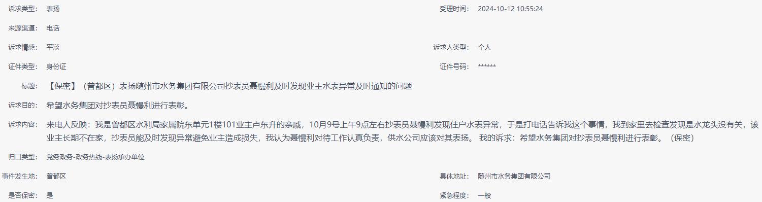 【保密】(曾都區(qū))表揚隨州市水務(wù)集團(tuán)有限公司抄表員聶慢利及時發(fā)現(xiàn)業(yè)主水表異常及時通知的問題 |