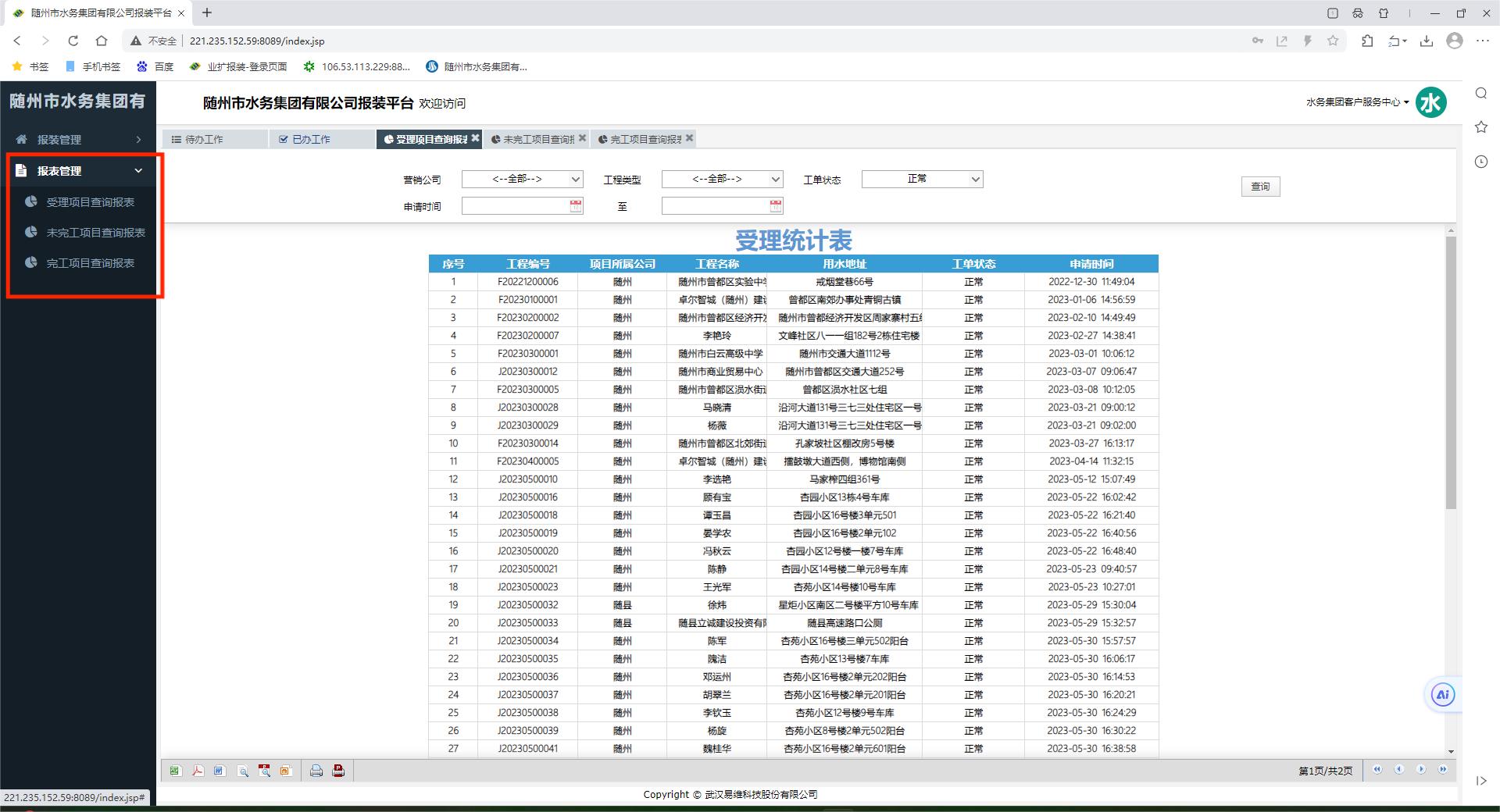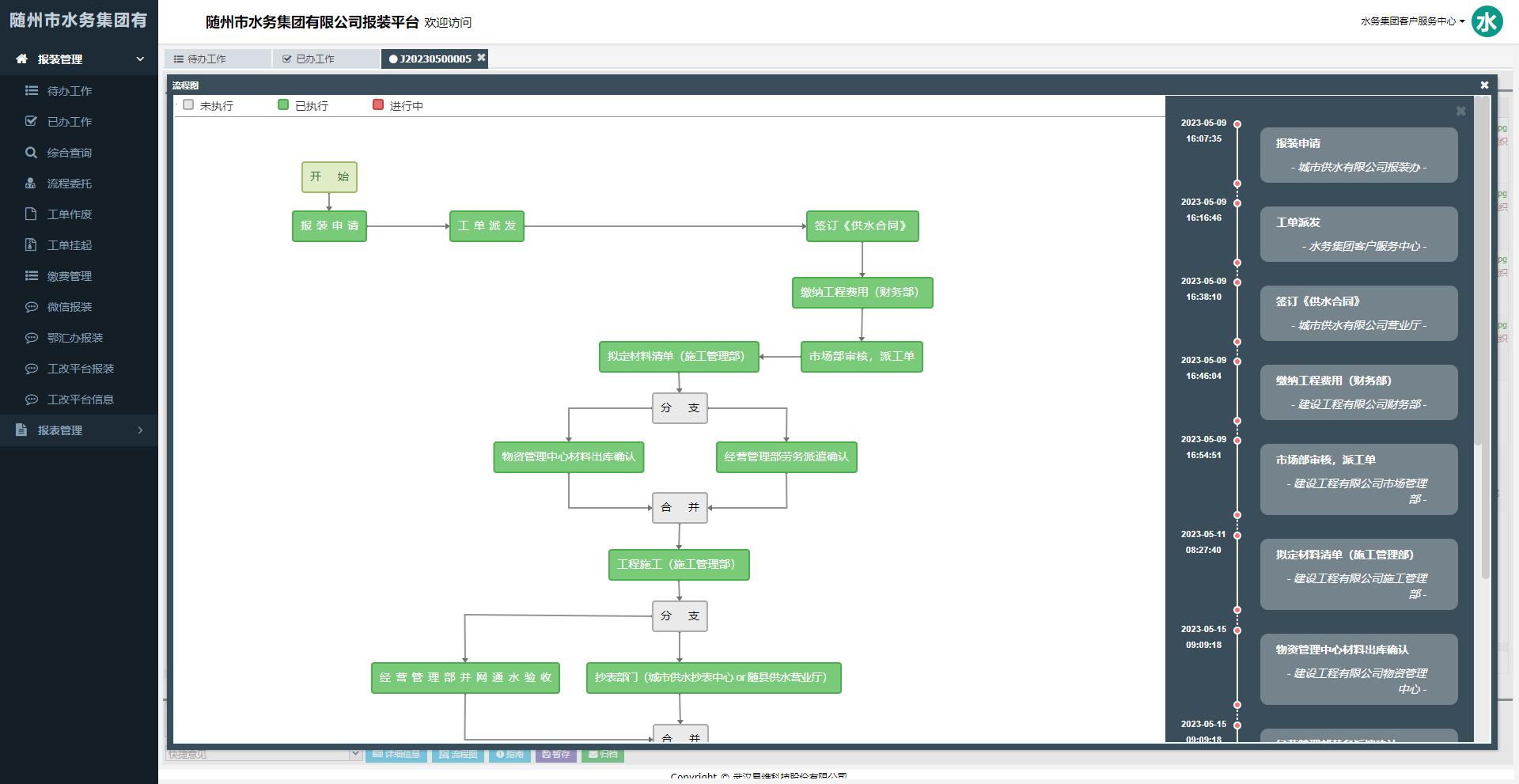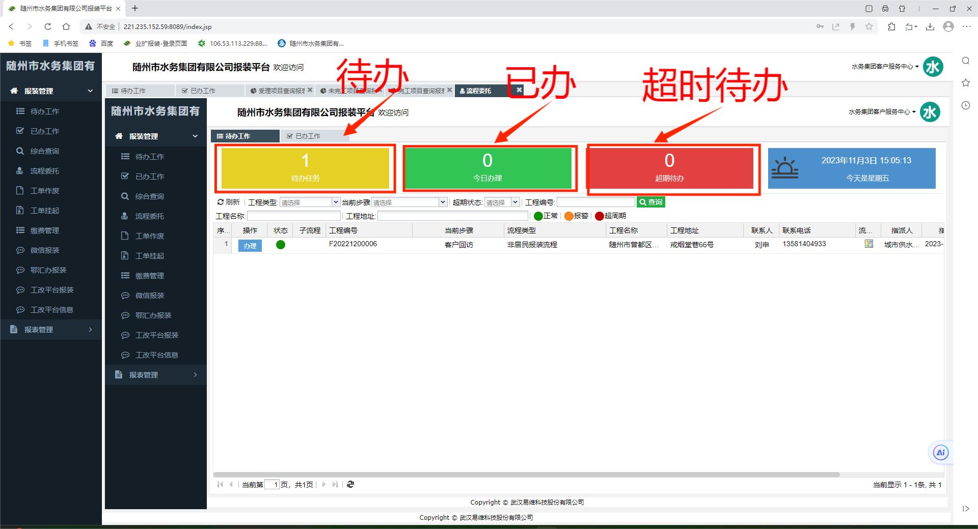 報裝業(yè)務(wù)管理系統(tǒng)通過流程監(jiān)測,對“待辦,已辦,超時待辦”的業(yè)務(wù)進(jìn)行分別處理,保證業(yè)務(wù)有效流轉(zhuǎn),及時辦結(jié)。