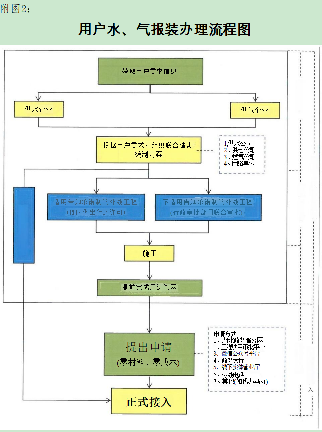 (二)方案確定。接到申請后,供水供氣企業(yè)實行主動上門,主動對接掌握用戶用水、用氣需求,完成現(xiàn)場勘察,提供咨詢服務,啟動方案編制。供水供氣企業(yè)按照“水電氣網(wǎng)接入聯(lián)動報裝”要求,以一張表格形式申請相關部門并聯(lián)審批,完成前置服務。