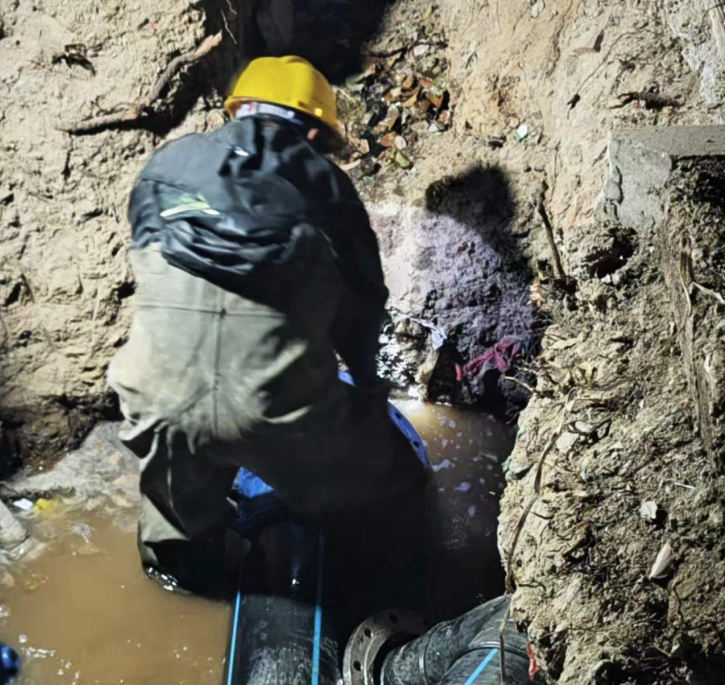 “末端”不末尾,問題不過夜。欣和電子位于高新區(qū)供水管網(wǎng)最末端,周邊聚集了多家24小時(shí)連續(xù)生產(chǎn)的企業(yè)。廠區(qū)用水報(bào)裝需在DN200管網(wǎng)破口接水,新安裝DN100機(jī)械表,既要穿越車流滾滾的主干道,又不能影響“鄰居”們一滴水的正常供應(yīng)。接到求助后,水務(wù)集團(tuán)建設(shè)工程公司立即啟動(dòng)“高新企業(yè)用水綠色通道”,青年突擊隊(duì)成員10分鐘集結(jié)完畢,技術(shù)骨干連夜踏勘現(xiàn)場。